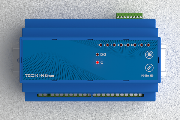 A PS-08m 230 vezetéken keresztül kommunikál a Sinum vezérlőegységgel a TECH SBUS buszon keresztül. A PS-08m 230 csatlakoztatása után önállóan vezérelhet egy adott táp/világítási pontot mind mobilalkalmazással, mind manuálisan egy fali kapcsolón keresztül.